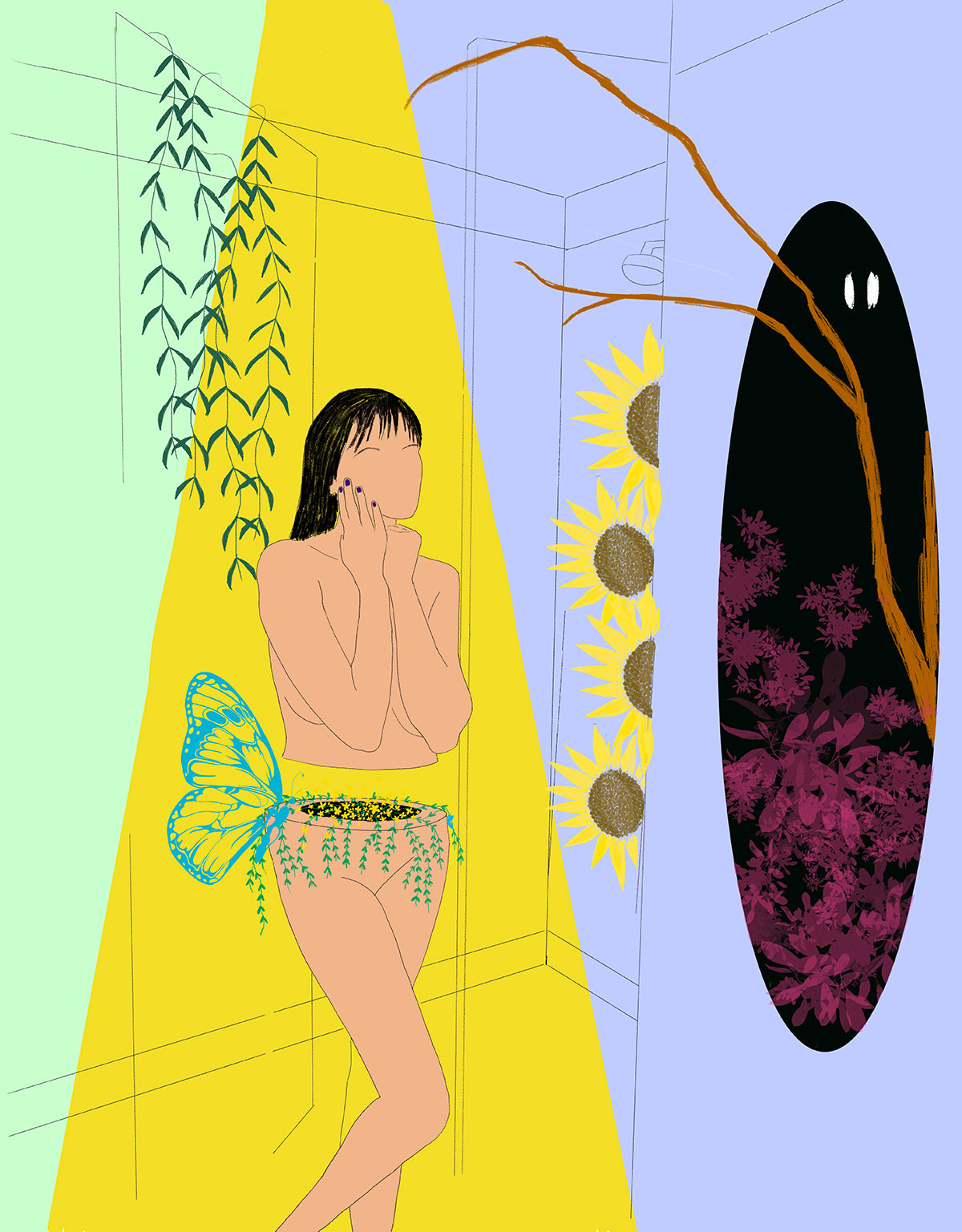 This illustration explores the surreal process of reconstructing a fractured sense of self after migration. The central figure embodies the “gaping void” I carried upon arriving in Australia, a physical manifestation of the traumatic experiences and relationships I was leaving behind. In time, this void has transformed into a vessel for growth. Trust is nature emerging from within; vines, sunflowers, and butterflies replace absence with renewal. The shift from a shadowed, watchful unknown to a warm yellow light reflects my passage from survival toward wholeness. No longer defined by escape, there has taken place a quiet blooming into self-discovery.