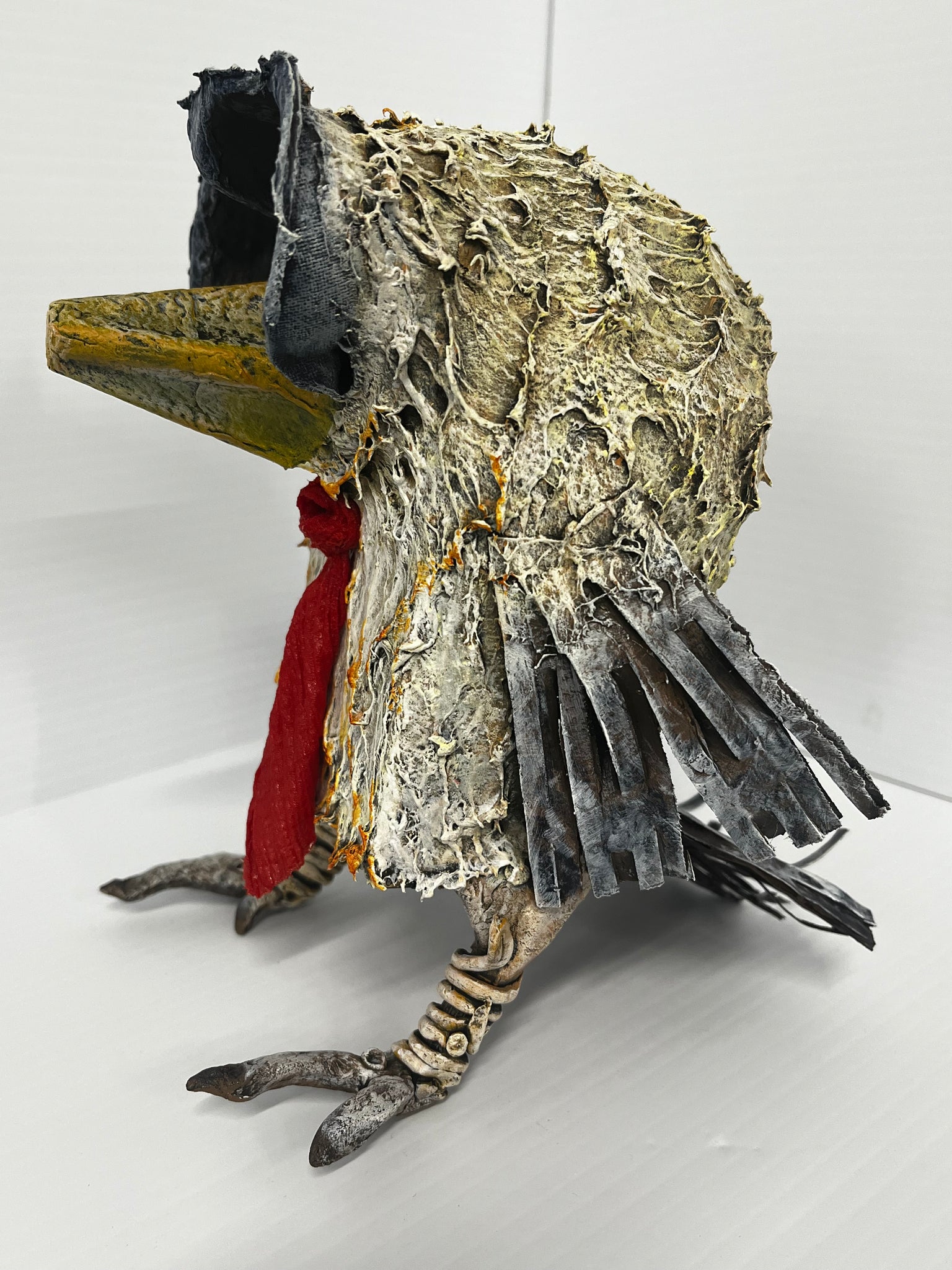 Egg carton, Card packaging, bamboo sticks, fabric, PTX air-dry clay, Powertex, galss eyes, acrylic paint