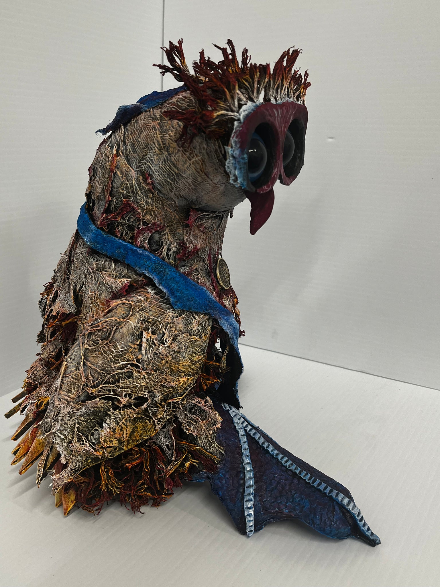 Plastic bottle, card packaging, cocnut fibre, shoe inserts, string, wadding, tissue paper, buttons, PTX air-dry clay, acrylic paint