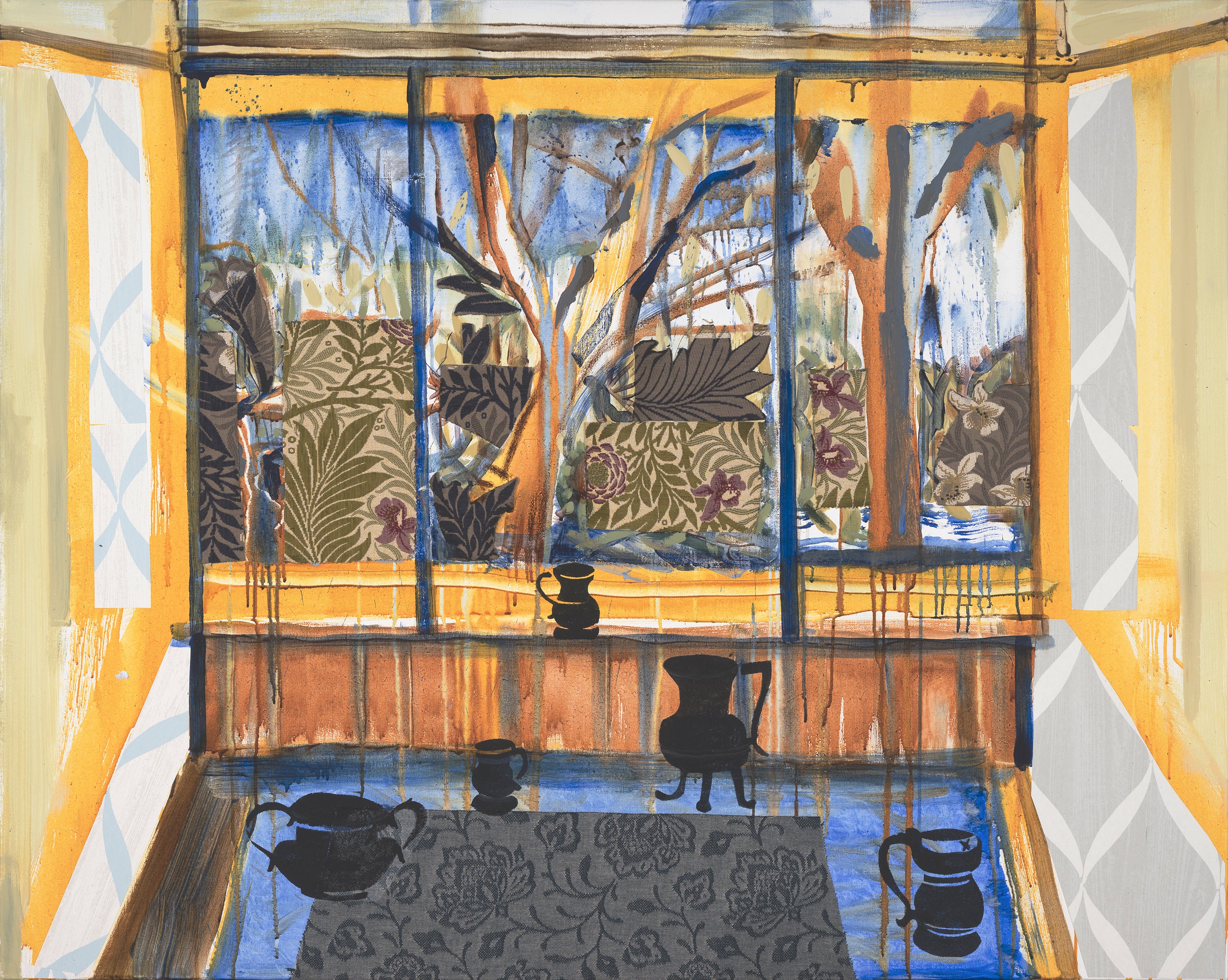 Matisse inspired me to paint this view looking out to my garden. I have worked with paint, wallpaper, fabric and stencils to create the scene. The silhouetted pewter jugs represent the people in my family history who have influenced my art practice.