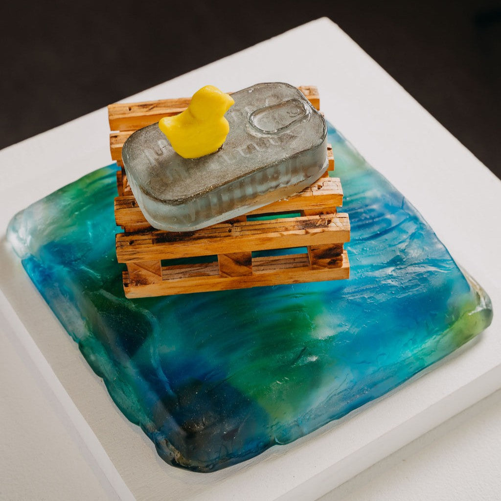 Cast glass crystal, cast recycled television screen glass, reclaimed timber, cast opaque glass