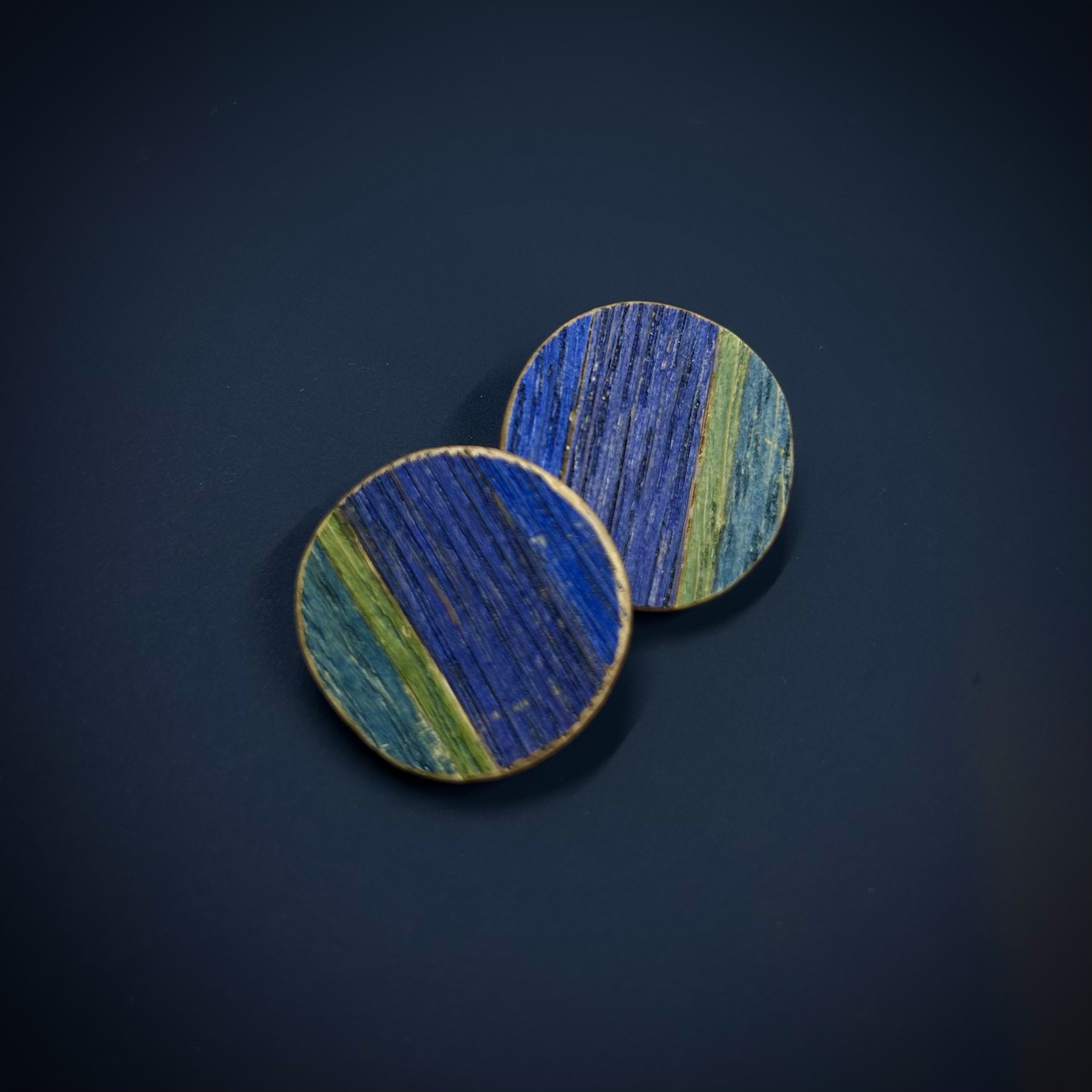 Striped - dark blues. Classic, fun and bold - the oak veneer is hand-stained and assembled onto solid oak timber using traditional parquetry techniques. Each piece is a unique design and finished with Danish oil and Sterling silver studs.