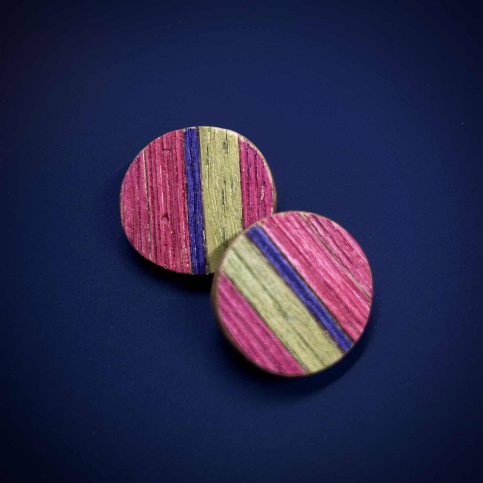 Striped - reds with green stripe. Classic, fun and bold - the oak veneer is hand-stained and assembled onto solid oak timber using traditional parquetry techniques. Each piece is a unique design and finished with Danish oil and Sterling silver studs.