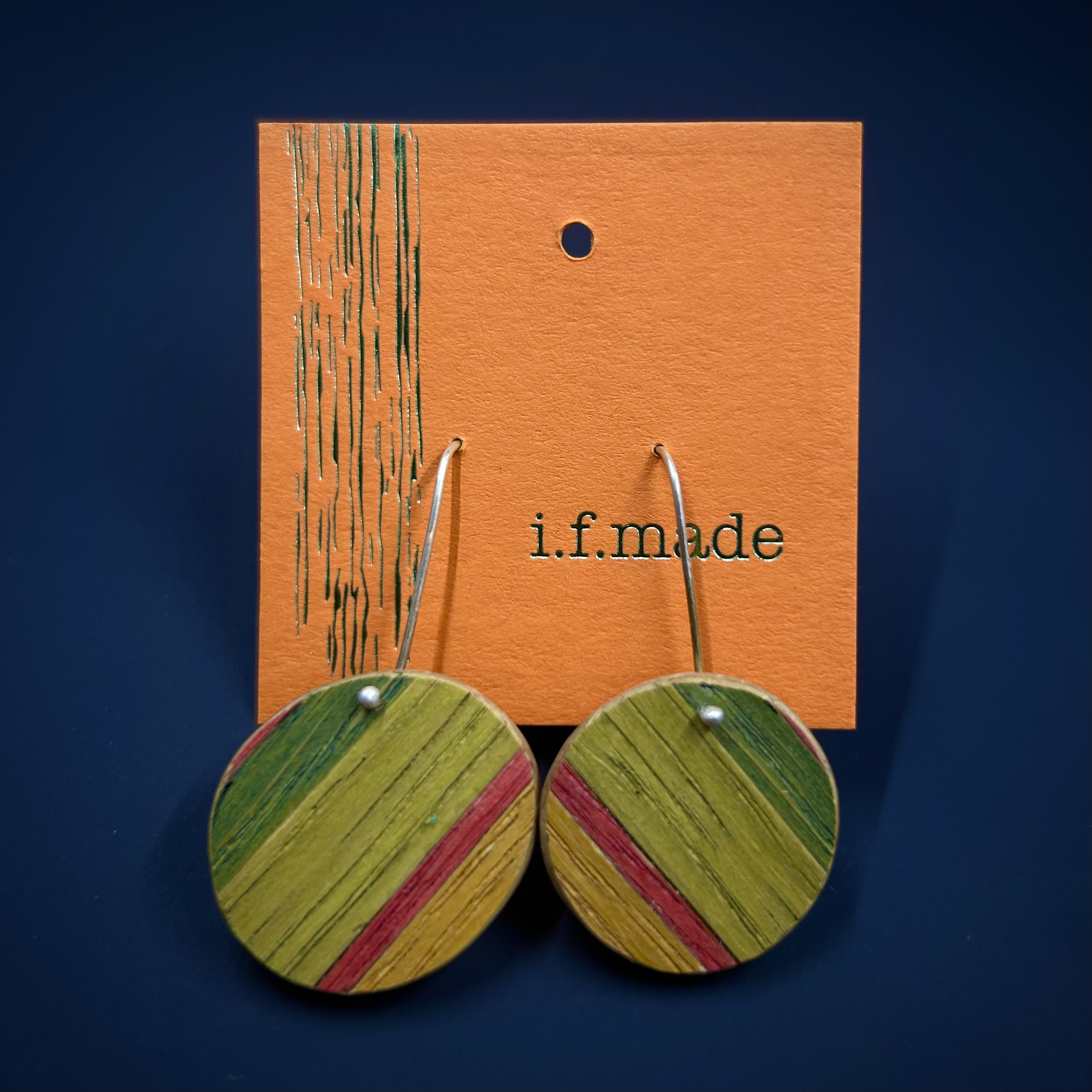 Striped - yellow and greens with red stripe. Classic, fun and bold - the oak veneer is hand-stained and assembled onto solid oak timber using traditional parquetry techniques. Each piece is a unique design and finished with Danish oil and Sterling silver hooks.