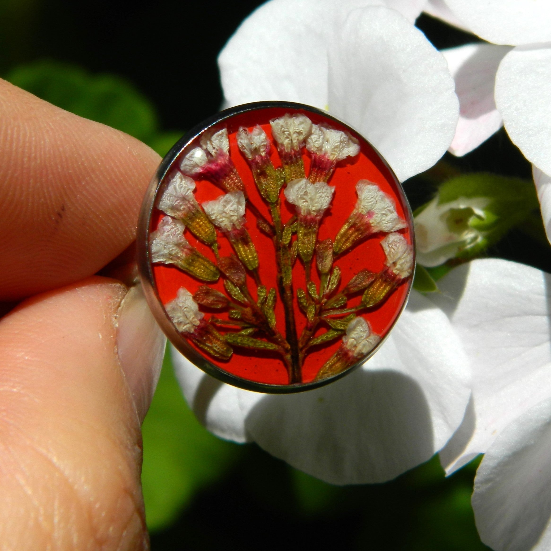 Australian native flowers on red background. Stainless steel ring, pressed flowers and resin.