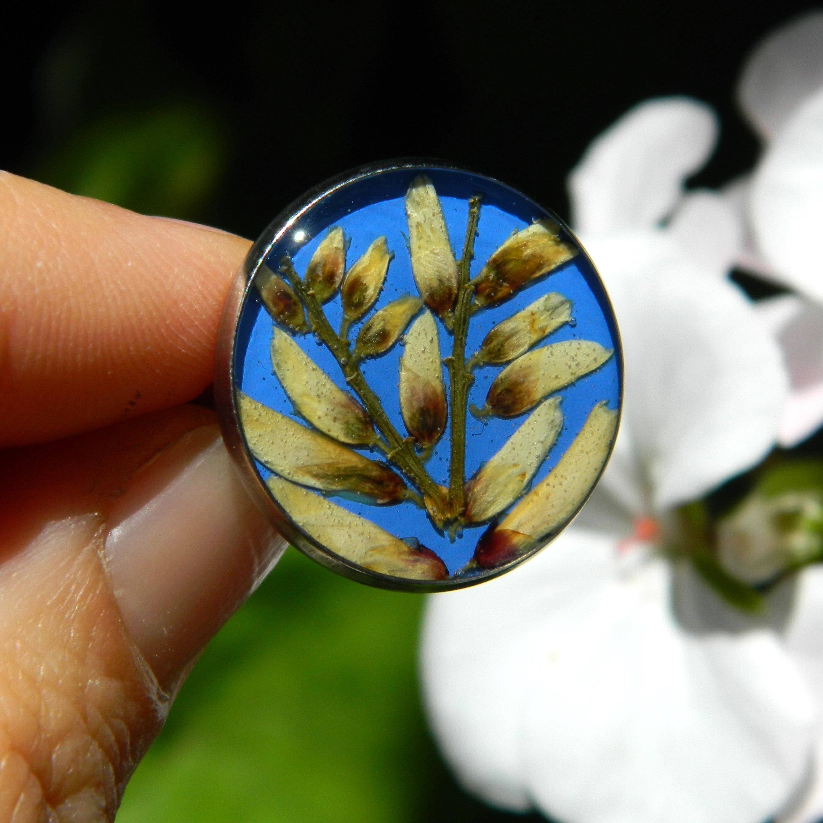 White weeping broom on blue background. Stainless steel ring, pressed flowers and resin.