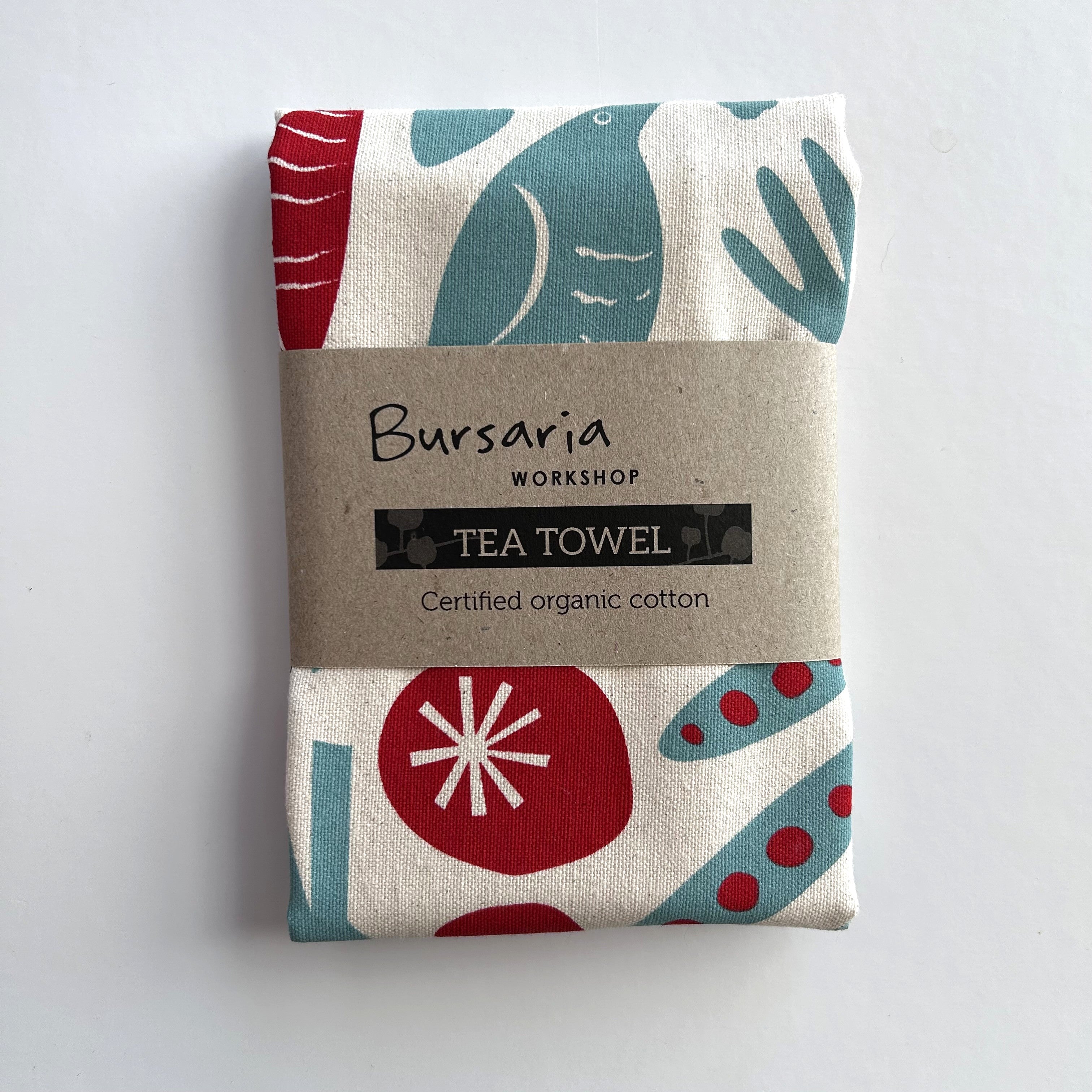 Available in red and light turquoise, this original wombat tea towel is screen printed on GOTS-certified organic cotton using solvent-free inks in my original Fronds & Flowers design.
