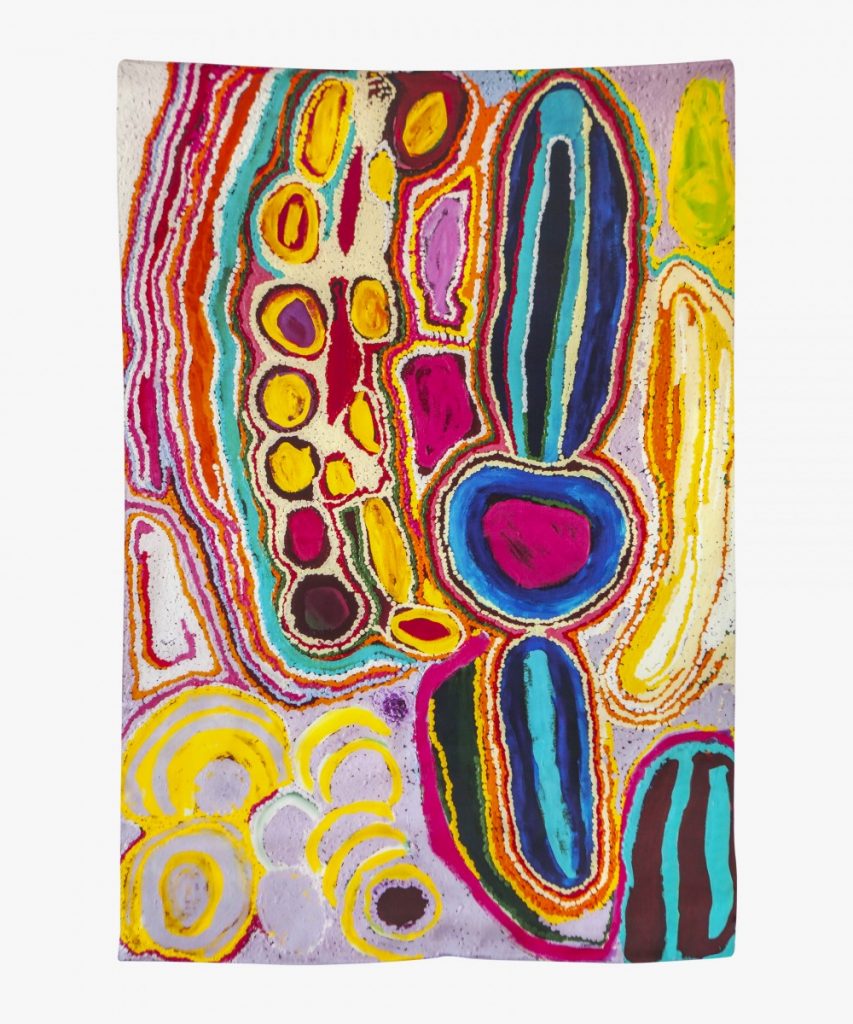 The electrifying work Parnngurr Area relates to the landscape surrounding the Martu community of Parnngurr in the Eastern Pilbara. Significant sites Yalpu, Wangkakarlu, Parnkurrl and Kurran Kurran are depicted – water sources that were crucial to the survival of Biljabu and her family during pujiman (traditional desert dwelling) times. Biljabu’s family travelled from place to place depending on the availability of food and water at these sites, and to fulfil social and ritual obligations.